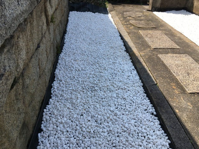 防草シートを敷き、打合せしたように白い石を敷き詰めました。